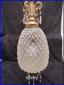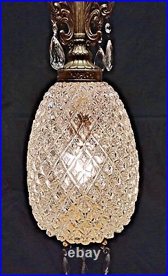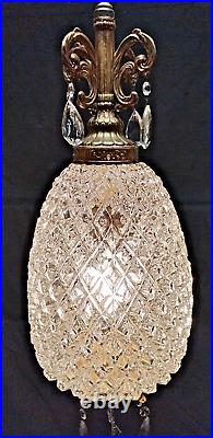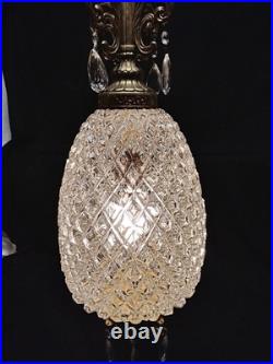 Elevate your interior décor with a touch of vintage glamour using this Hollywood Regency Clear Glass Hanging Swag Lamp. The lamp features a stunning pineapple-shaped shade, adding a classic and sophisticated touch to any indoor space. With its adjustable 10-foot white cord, you can easily customize the height to suit your room's ambiance. Crafted from frosted glass with a warm yellow light, this swag lamp brings a cozy, yet vibrant atmosphere to your living area or bedroom.