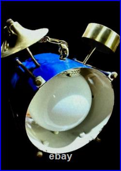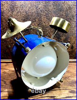 Has bass drum, cymbals and drummer sticks. Has white glass globe inside of drum. Uses 1 standard base bulb.