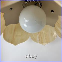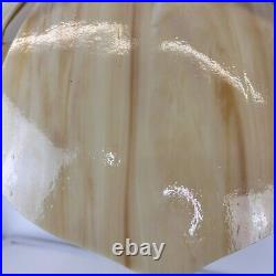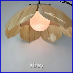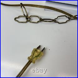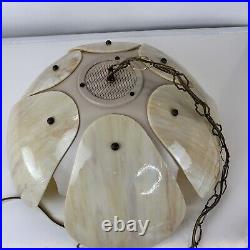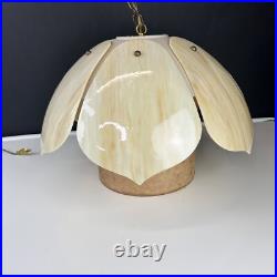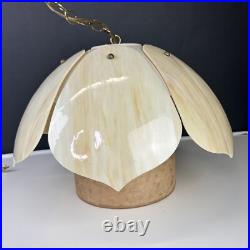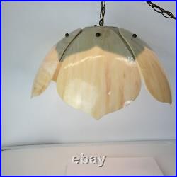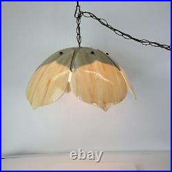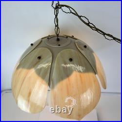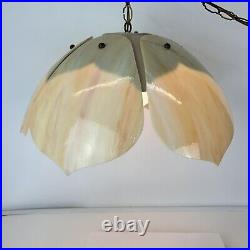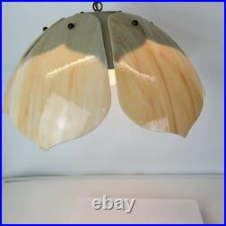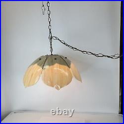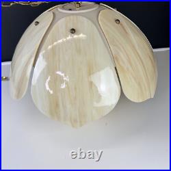 Each panel has different veining of color giving the lamp its own style. The lamp is 9" tall and 20" wide. This lamp just screams mid century. The chain is 12' long and the cord is about 14 feet long and has a roller switch and a good plug. It would be very easy to make this a hard wired ceiling lamp if that is your need.