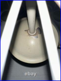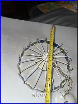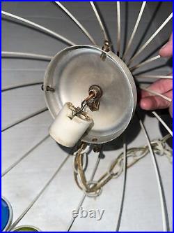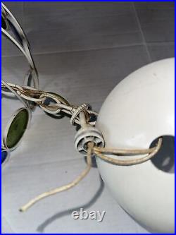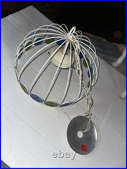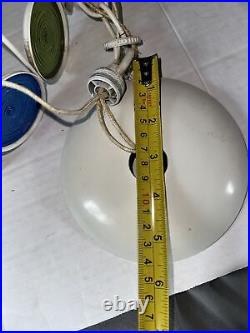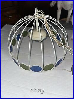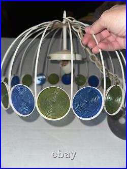 This rare MCM Retro hanging light is a must-have for any boho hippie enthusiast. The round green blue bakelite medallions add a touch of vintage charm to any room. The corded power source and white cord color make it easy to install and use. Measuring 18cm in diameter and 16cm in height, this swag lamp is perfect for hanging in any room.