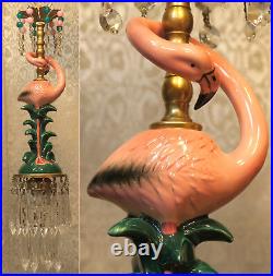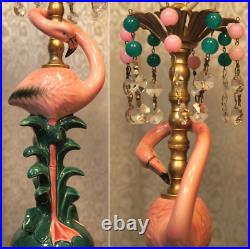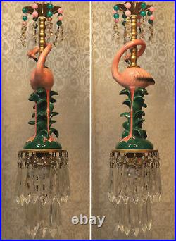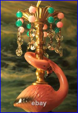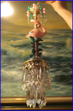 Glass Opaline Pink and Jade green swag garlands dripping from the top crown leaf; There is one porcelain bird with outstretched wings around the center. Two tiers of large Icicle prisms around the bottom of the fixture; Fountain of dripping beads and crystals at the top bobeche. The metal on this lamp is a combination of brass/ and tole metal painted gold tone. The chandelier is a 1 light fixture, that takes a standard base size bulb up to 150 watt (not incl). New wiring and porcelain socket; It is a swag plugin fixture, comes with 9' foot long cord with switch in line and plug at the end and you can hang it anywhere in the room and plug into a wall outlet.