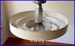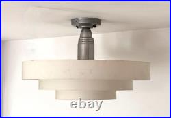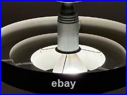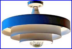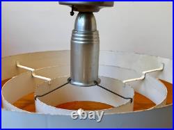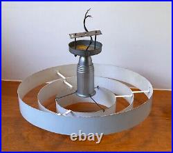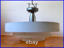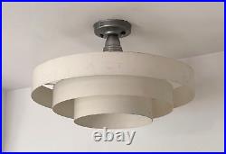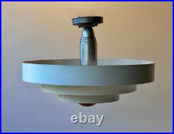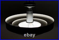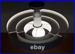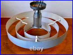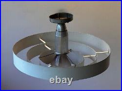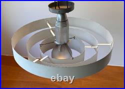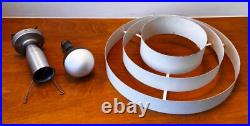 Silver aluminum stair step hardware with single large socket. Features large white steel 3 ring shade. In good original condition, works great.