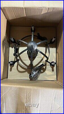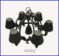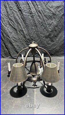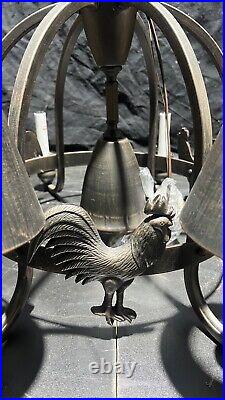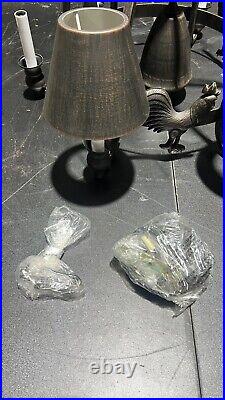 This is a vintage 7-light rooster chandelier lamp designed for indoor use. The chandelier is made of iron with a black finish and features a unique rooster design.