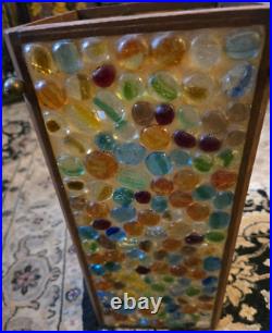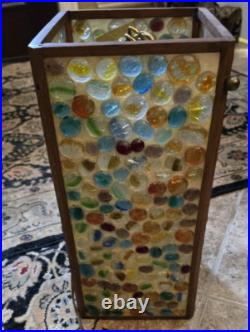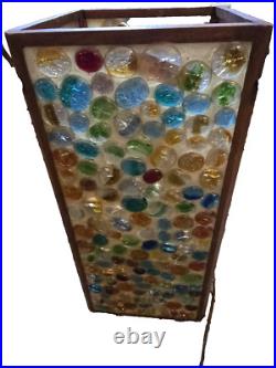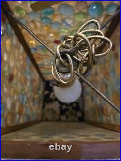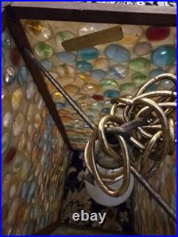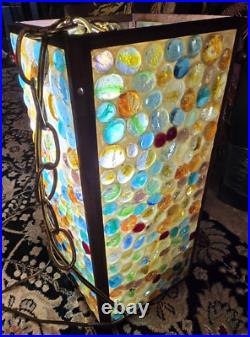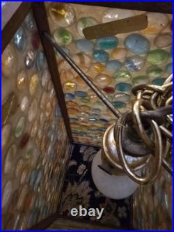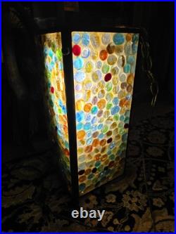 This is a vintage possibly antique stained glass rectangular hanging light fixture. It is very unusual how it was made with all the stained glass pieces.