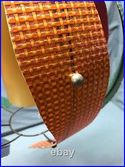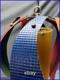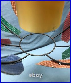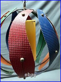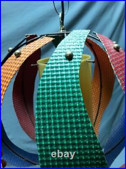 Nice interior vintage midcentury modern hanging 18 diameter ceiling light fixture. The fixture is made of a thin steel frame with decorative fiberglass panels. The panels are complete without any broken pieces. Nice mix of blue, green, orange and red. The center custard shade is made of a composite material.