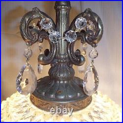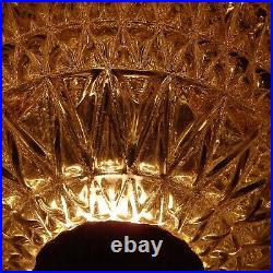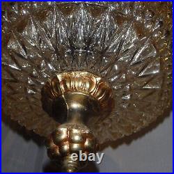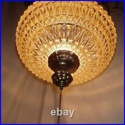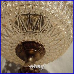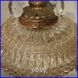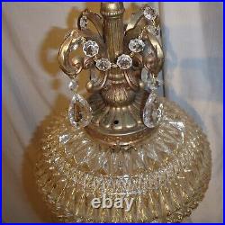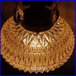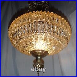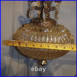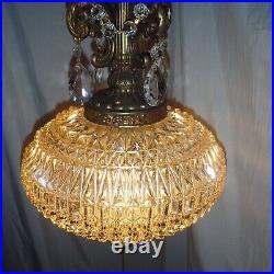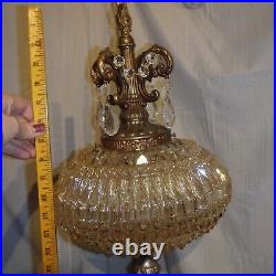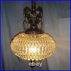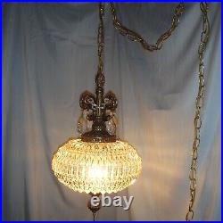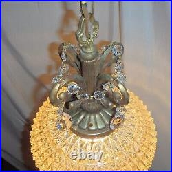 Super cool swag lamp, featuring a glass globe shade of cut crystal glass, top and bottom of the glass globe have a slight gold/iridescent color, I tried to capture it in the photos but it looks best in real life. 4 dangling crystals and beaded crystal strung across the top of the crystals. Single bulb, will take a 60 watt bulb or more using LED. Globe has a small chip on the edge where it meets the metal at top, will never be seen, and a small crack under the finial at the bottom, again you can't see it since it's covered with metal.