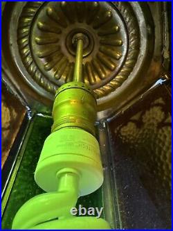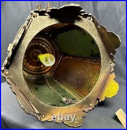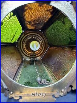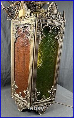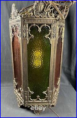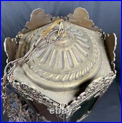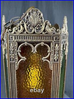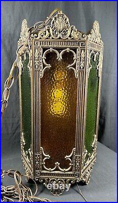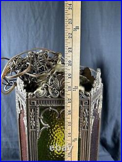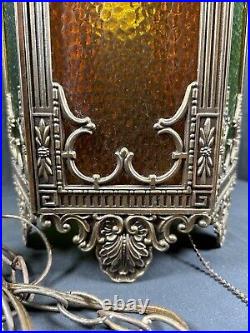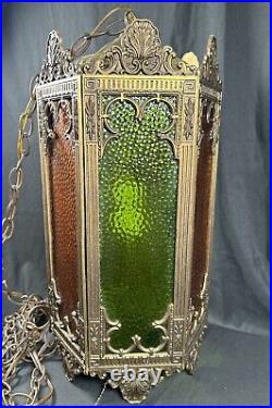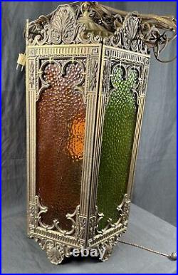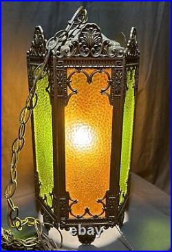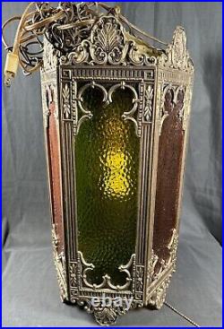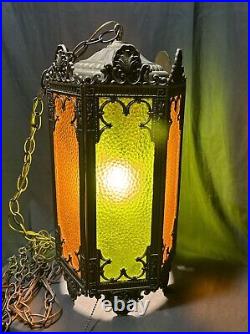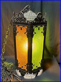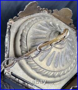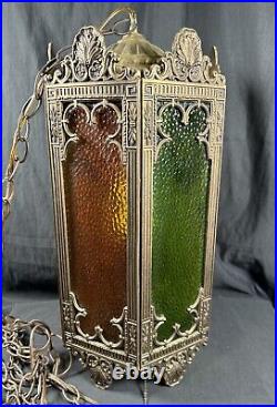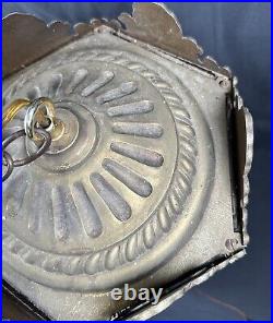Vtg MID Century MCM Glass Metal 6 Panel Large Heavy Hanging Swag Light 21h