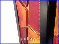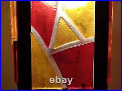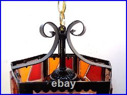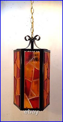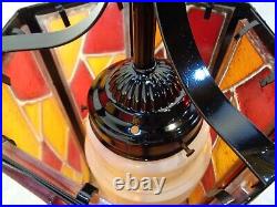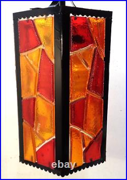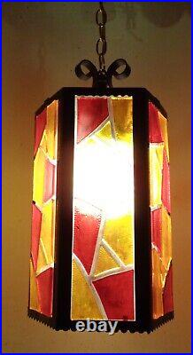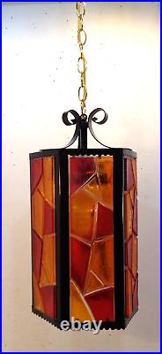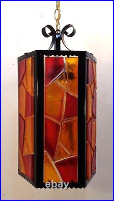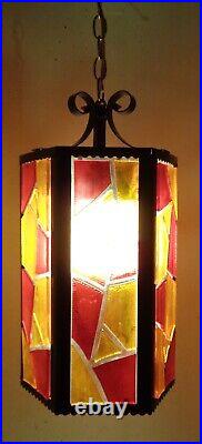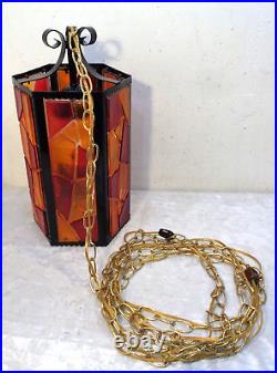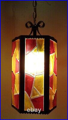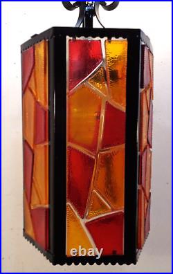 Tested and working with cord and all electrical in good condition. Features a metal fixture with multicolor chunky acrylic lucite panels, white glass globe and gold chain.