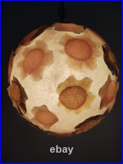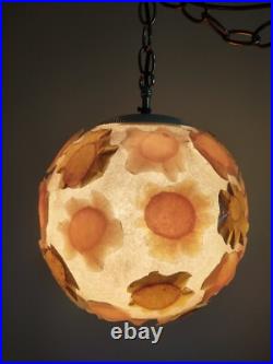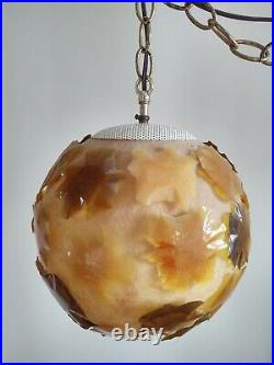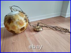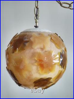 This is a vintage mid-century modern swag lamp made of chunky Lucite in a brownish and tan color Definitely would add vintage appeal to any home. This was a Chicagoland estate sale find.