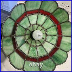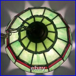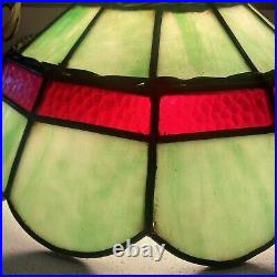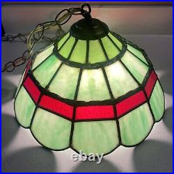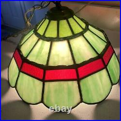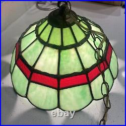 Vintage hanging Tiffany style lamp with green and red stained glass and brass hardware. Functions as shown in images. Great for a pool hall or room, maybe even an at home bar!