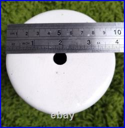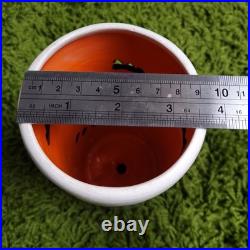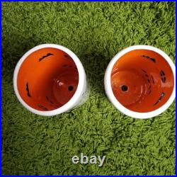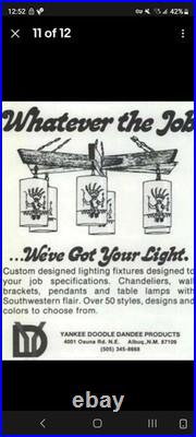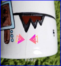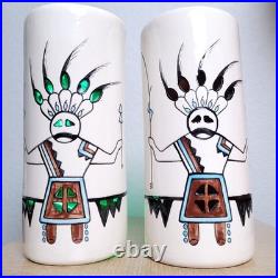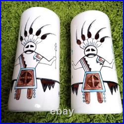 Vintage 70s-80s Yankee Doodle Dandy Kachina ceramic swag lamps - matching pair, hand painted, and artist signed. Glazed orange interiors and mounting holes at the top for fitting hanging swag lamp fixtures. Does not include the light fixture or components. 8.5" tall and 4" in diameter. One has a hairline crack near the bottom, visible inside and out. Both pieces show surface crazing consistent with age.