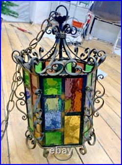 Wrought Iron Spanish Revival Gothic Hanging Swag Lamp Stained Glass Mid Century. Six sided with multi colored glass panes and a six foot long chain. Lamp measures 17 inches high and 10 inches in diameter.