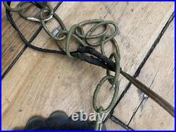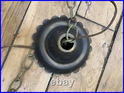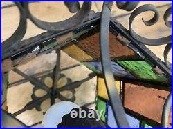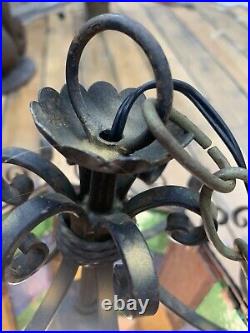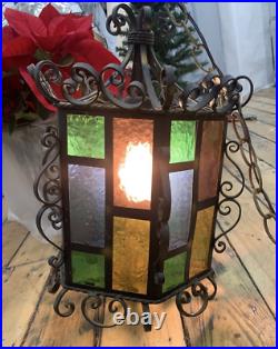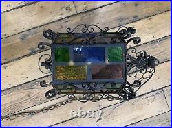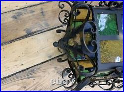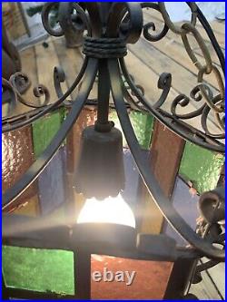Wrought Iron Spanish Revival Gothic Hanging Swag Lamp Stained Glass Mid Century